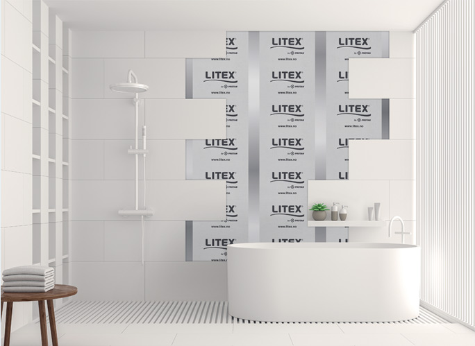 Litex membranduksystem gir en rask og enkel montering på vegg og gulv som et komplett system. Duken passer til alle faste underlag som for eksempel gips, våtromsplater og betong.